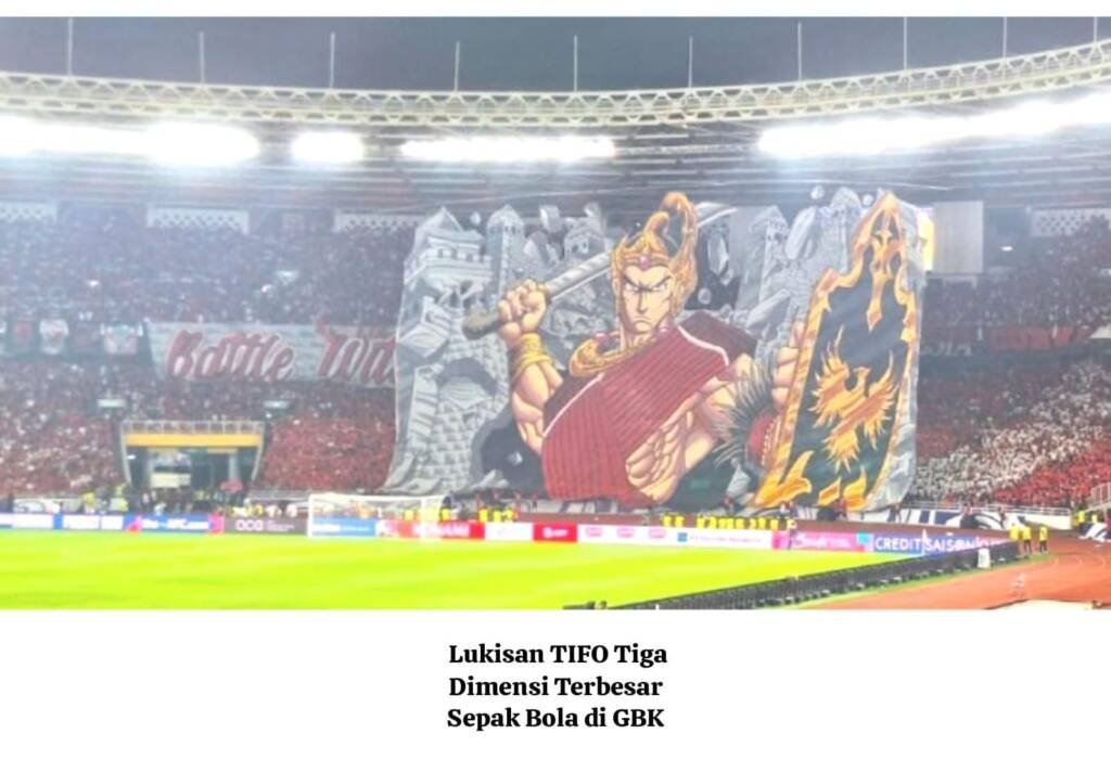 Beberin.com, JAKARTA — Bukti dari kolaborasi sebanyak 25 seniman lokal dan komunitas La Grande, itu menghasilkan tifo yang monumental lukisan tangan raksasa bergambar pejuang Nusantara yang berkibar di tribun utama GBK.