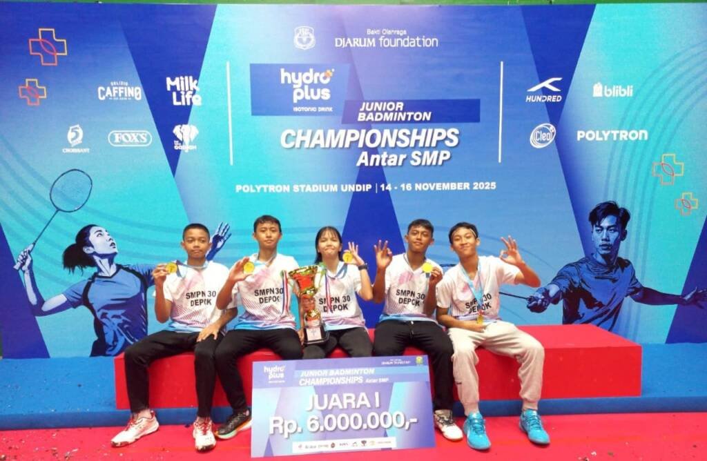 Tim bulutangkis SMPN 30 Kota Depok sukses raih juara 1 di Kejuaraan Bulutangkis Beregu Antar SMP HydroPlus Badminton Championships 2025 di Polytron Stadium Universitas Diponegoro, Semarang.
