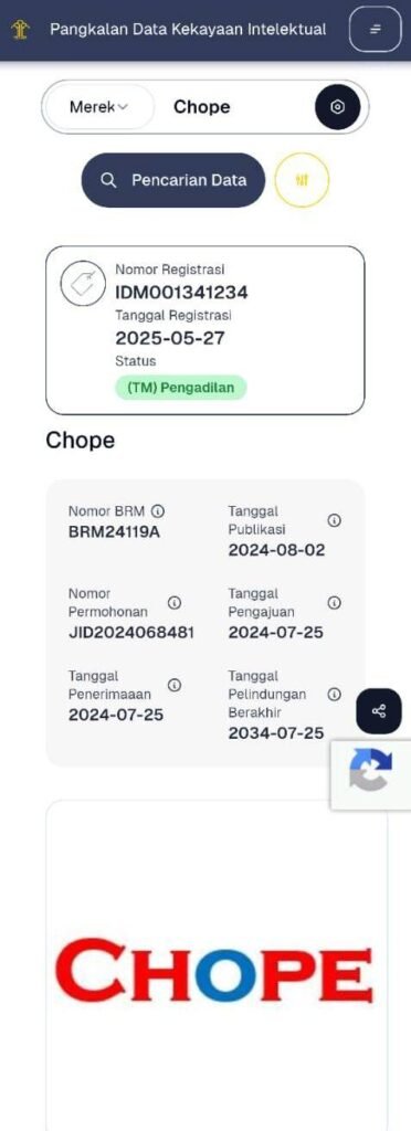 Jika ditelusuri masuk ke Website Pangkalan Data Kekayaan Intelektual data per 16 April 2026 Merk CHOPE atas nama pemilik Julianto Saloma Parluhutan Sirait sudah melakukan pendaftaran dengan Nomor Permohonan : JID2024068481