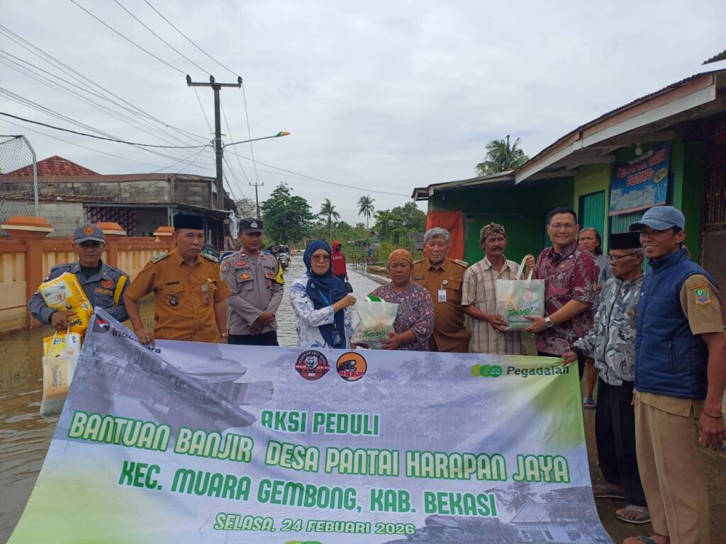Beberin.com, Bekasi – PT Pegadaian melalui Cabang Bekasi Utama menyalurkan bantuan kemanusiaan bagi warga terdampak banjir di Desa Pantai Harapan Jaya, Kecamatan Muara Gembong, Kabupaten Bekasi. Bantuan ini merupakan bentuk kepedulian perusahaan terhadap masyarakat yang terdampak bencana banjir sejak 10 Januari 2026.