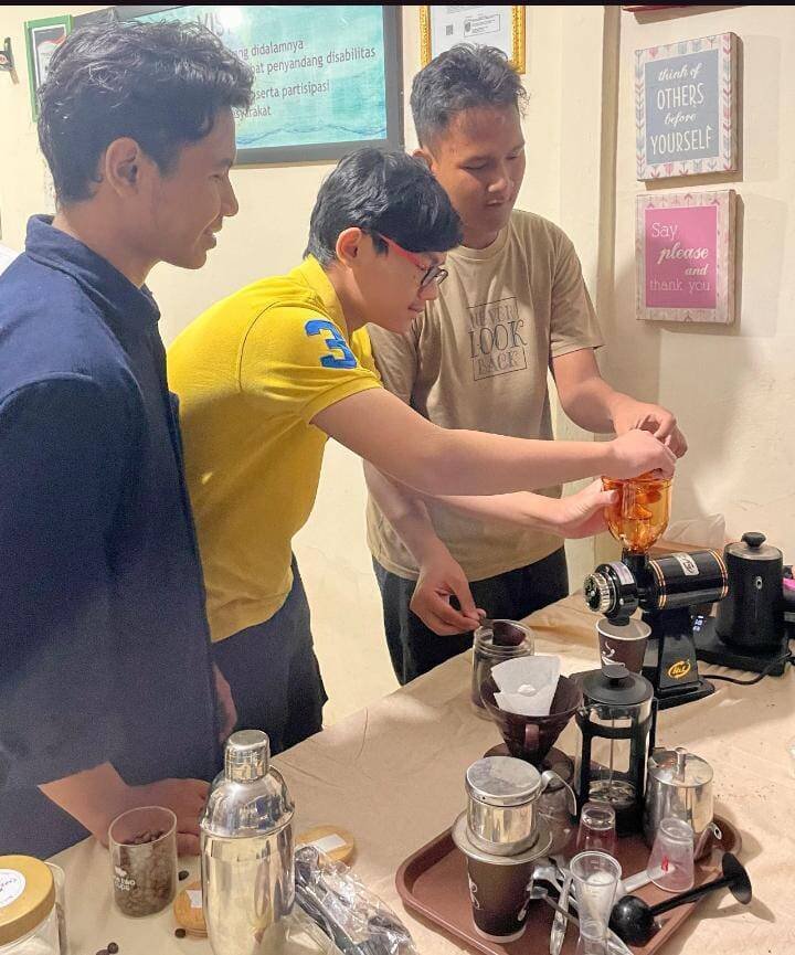 namun yang membuatnya istimewa terletak pada tangan terampil di balik setiap cangkirnya. Hilmi beserta peserta difabel dari Teman Yayasan Wahana Inklusif Indonesia tengah menuangkan hasil racikan kopi pertama mereka. Dengan bimbingan hangat dari barista difabel