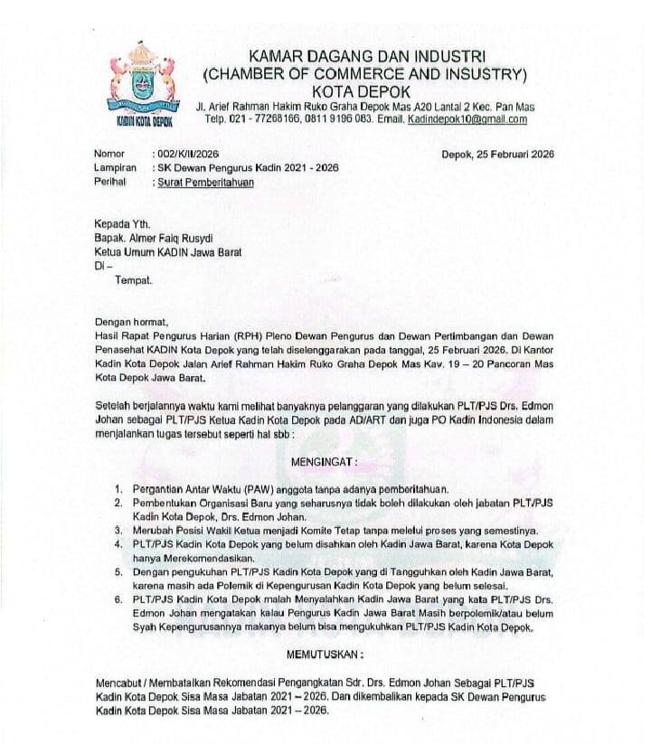 Edmond Johan dipaksa mengembalikan Surat Keputusan (SK) nya kepada Dewan Pengurus Kadin Kota Depok yang lama. Hal itu tertuang melalui Surat Kadin bernomor 002/K/II/2026 yang berisi tentang Surat Pemberitahuan yang ditujukan kepada Ketua Umum Kadin Jabar, Almer Faiq Rusydi.