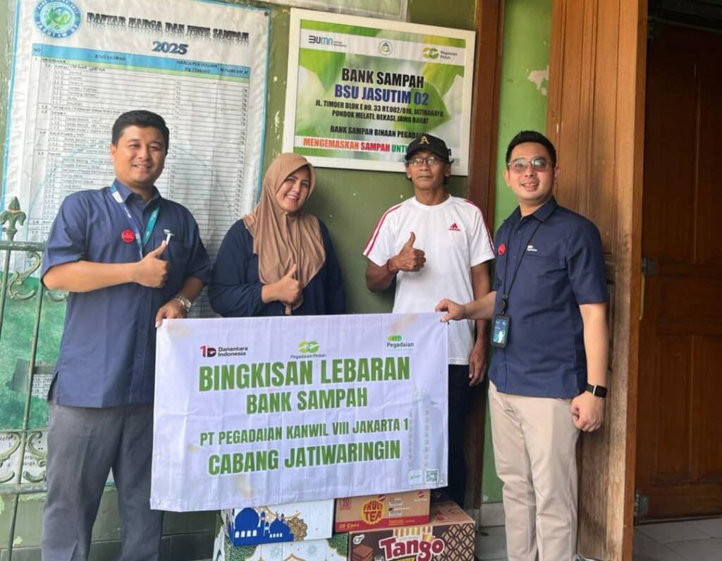 Beberin.com, Jakarta – Sebagai bentuk komitmen dalam menjalankan program Tanggung Jawab Sosial dan Lingkungan (TJSL) serta mendukung gerakan ekonomi sirkular. PT Pegadaian Area Jatiwaringin menyerahkan bingkisan apresiasi kepada pengurus dan nasabah Bank Sampah Unit (BSU) Jasutim II (Jaring Sutra Jakarta Timur Il) pada hari Rabu, tanggal 11 Maret 2026.